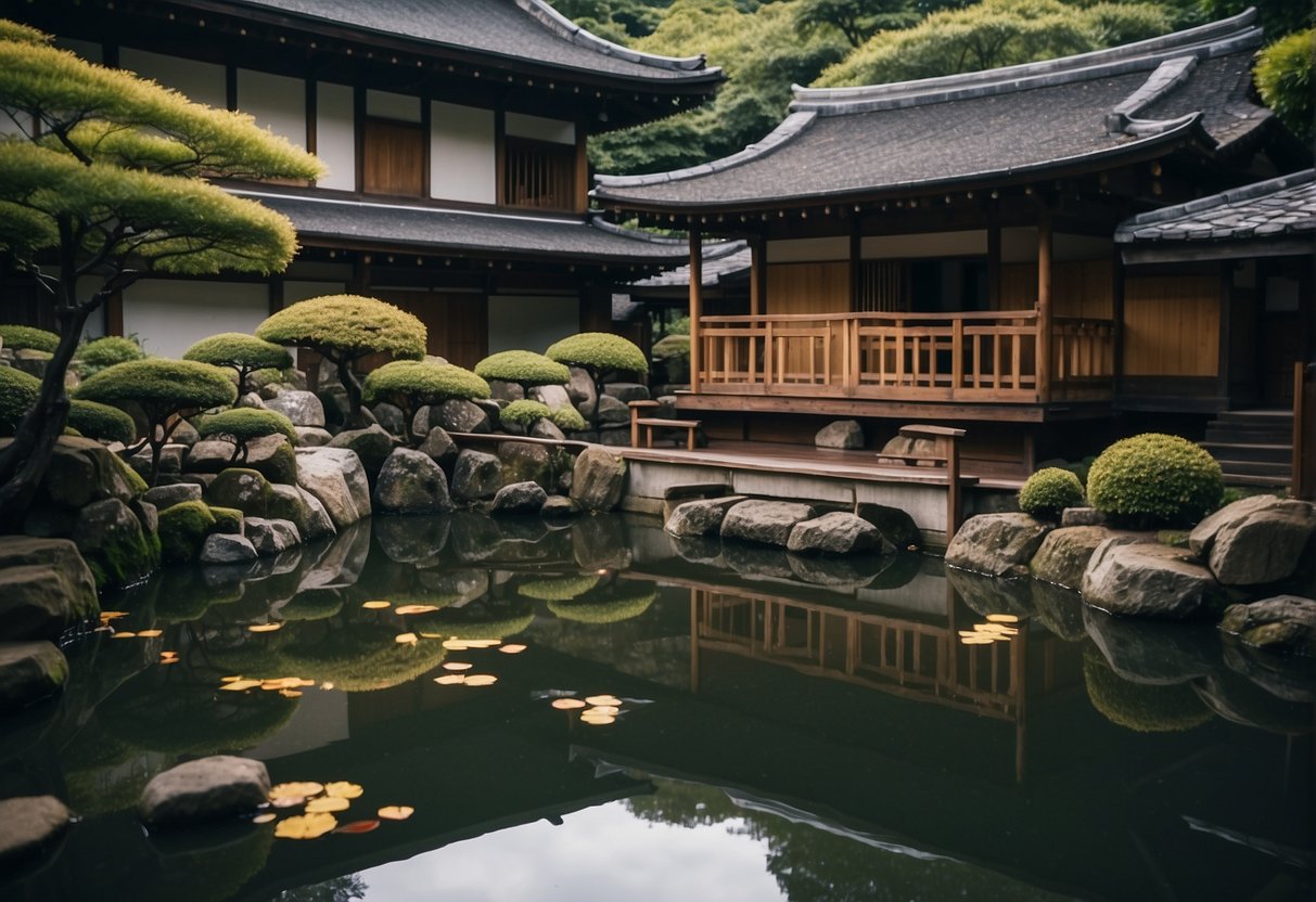 A serene Kyoto spa with traditional wooden architecture, surrounded by lush greenery and a tranquil koi pond