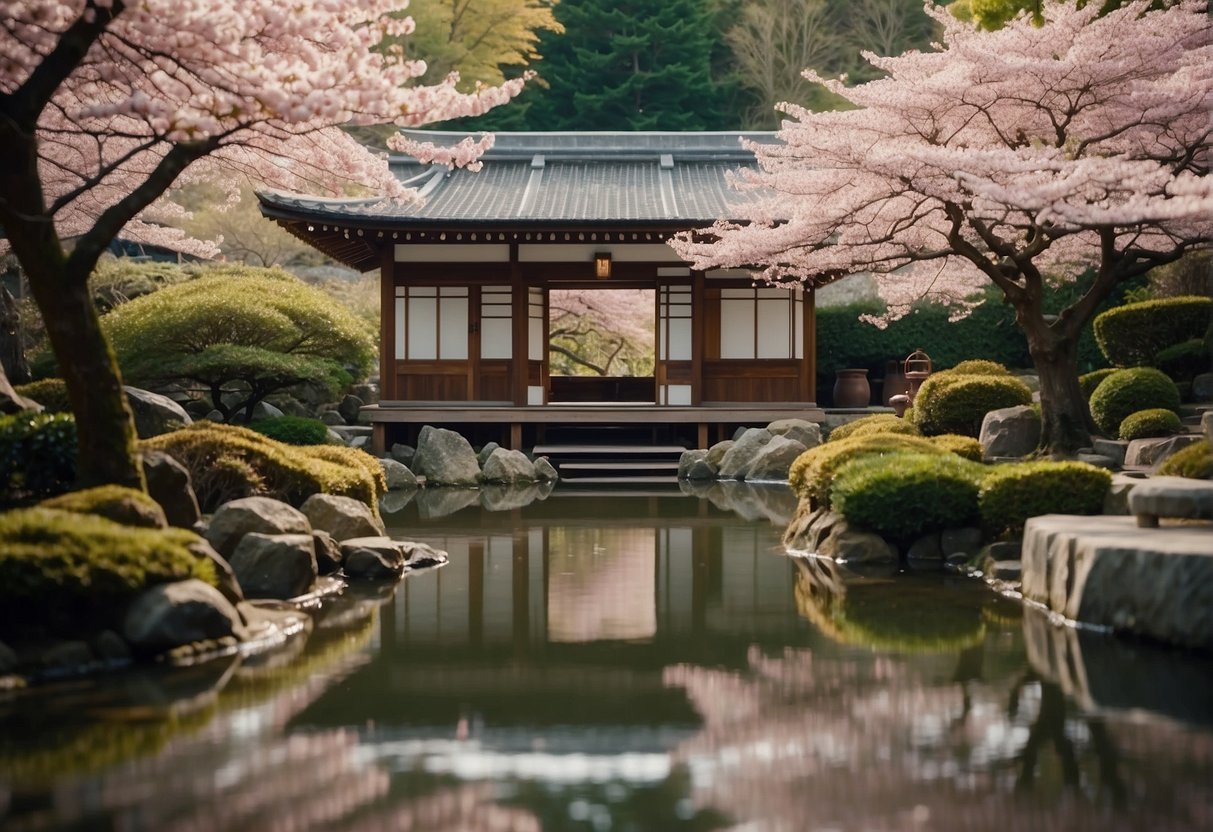 A tranquil garden with a traditional Japanese wooden spa building surrounded by cherry blossom trees and a peaceful koi pond
