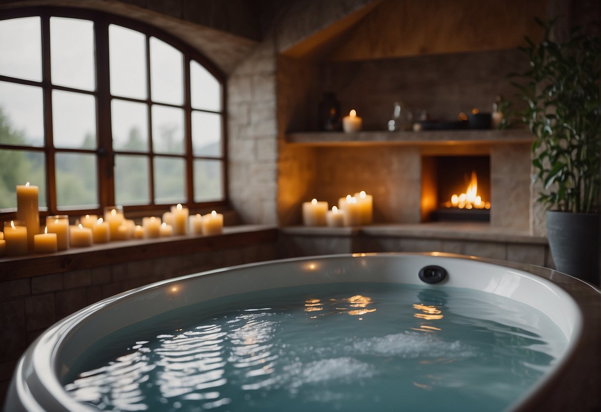 A tranquil spa room with plush robes, flickering candles, and a bubbling hot tub, creating an atmosphere of relaxation and indulgence