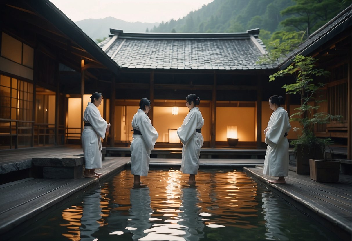 Guests bow before entering onsen. Shoes removed, robes donned. Quiet whispers fill the air. Steam rises from the hot spring. Peaceful ambiance