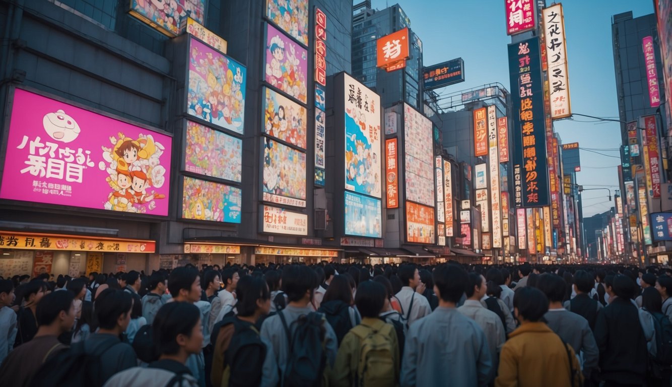 Vibrant anime billboards line the streets of Osaka, with colorful characters and futuristic designs, drawing in crowds of enthusiastic fans