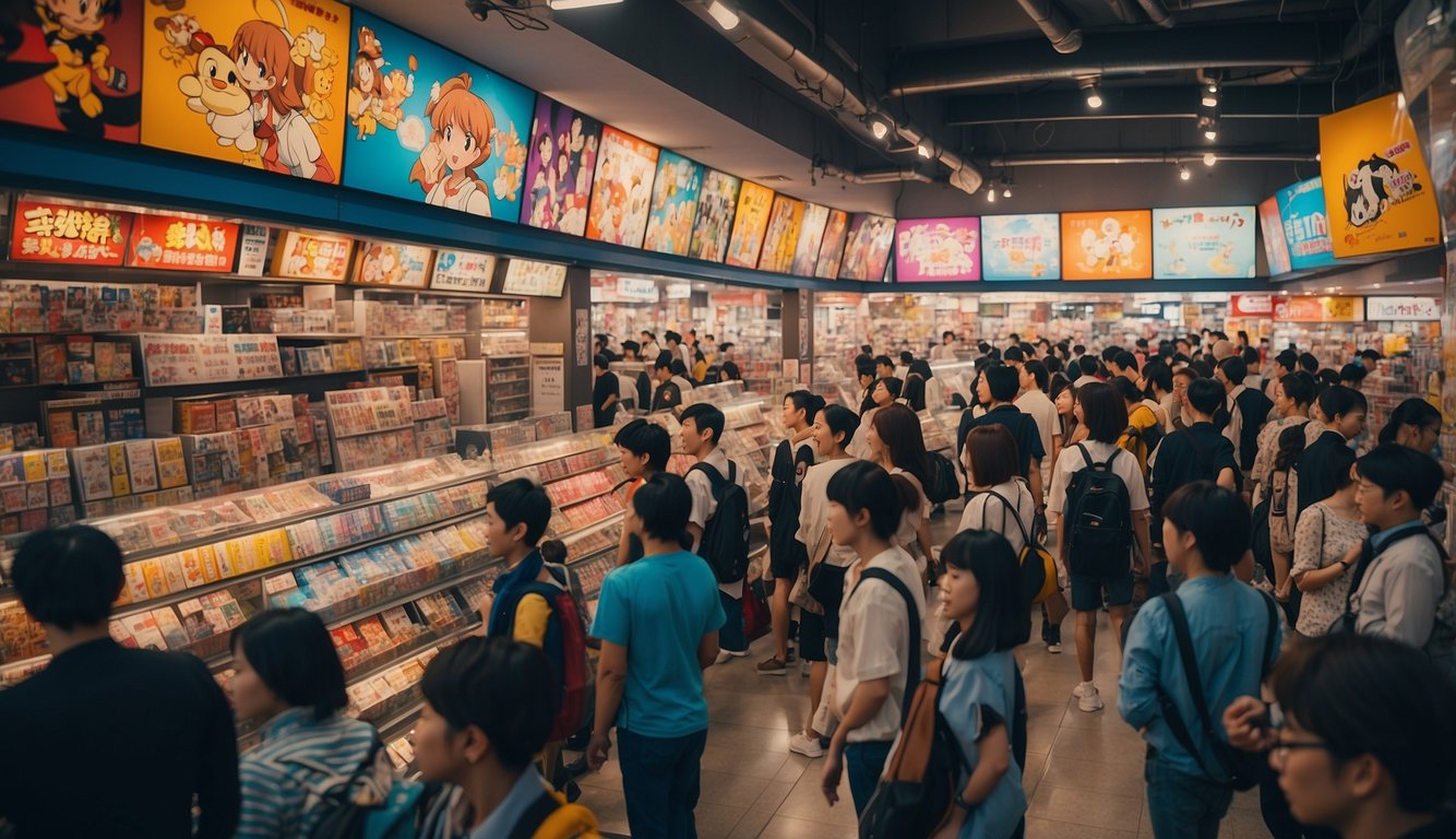 Crowded anime shops in Osaka, filled with colorful merchandise and enthusiastic fans browsing shelves and displays