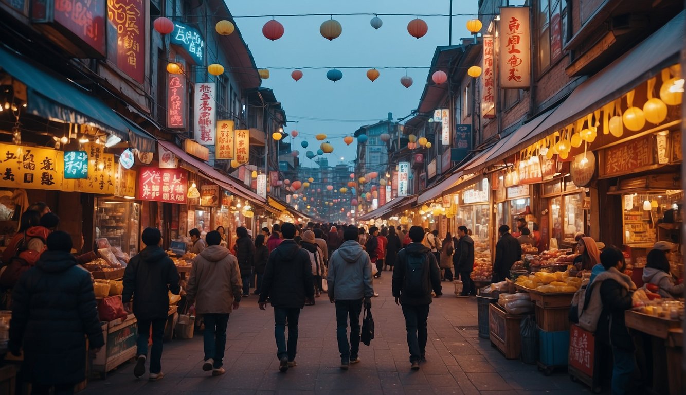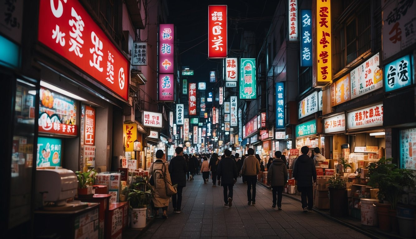 A bustling street in Den Den Town, with bright neon signs and crowded shops, showcasing the vibrant and lively atmosphere of the bustling district